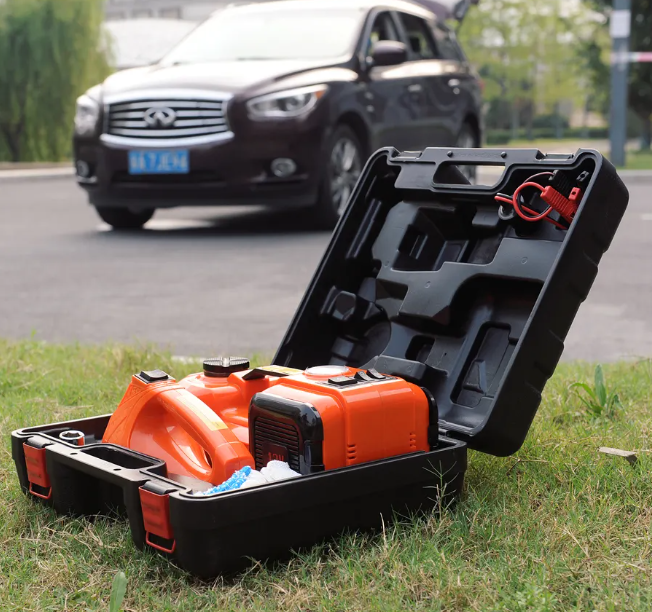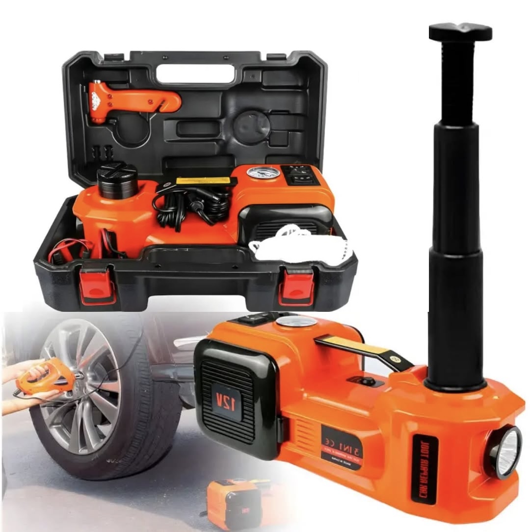 Домкрат працює автоматично, без фізичних зусиль, піднімаючи автомобіль одним натисканням кнопки. Міцна сталева платформа та стабільна конструкція забезпечують високий рівень безпеки. Компресор дозволяє швидко накачати шини, а вбудований ліхтар допоможе працювати навіть у темний час доби.